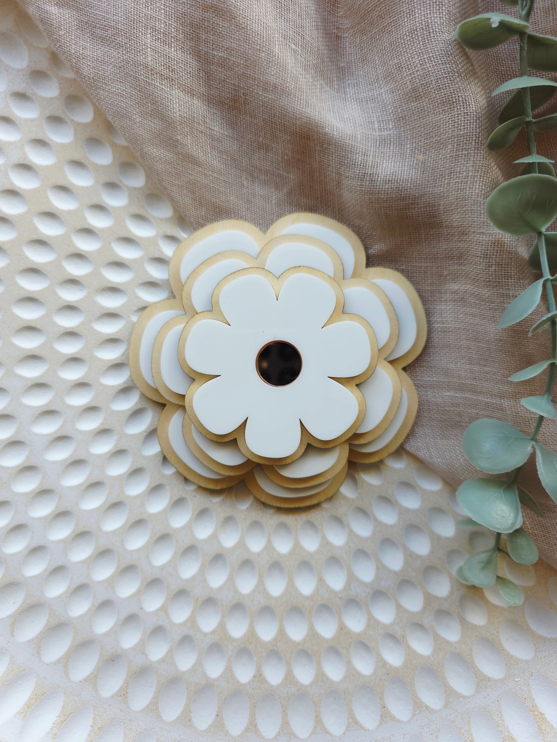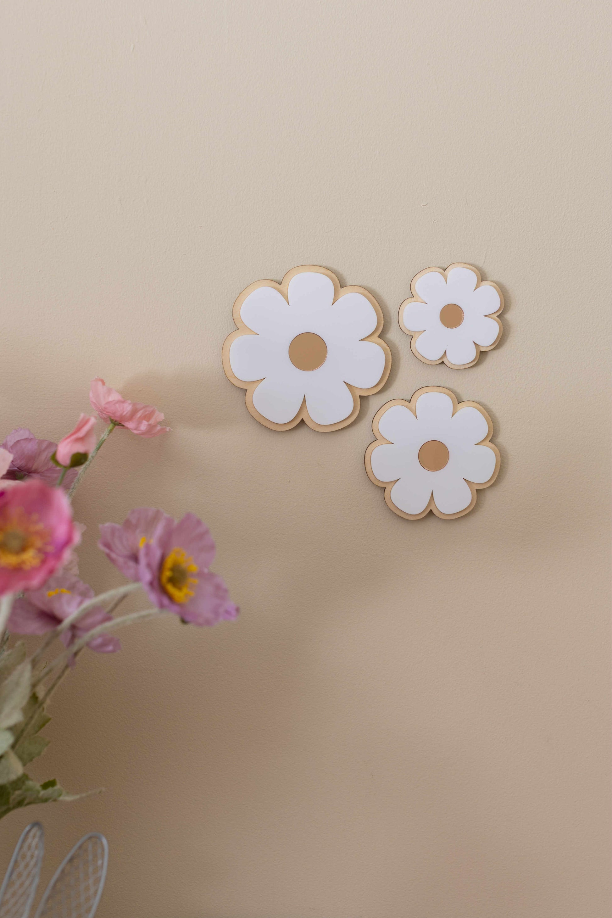 Bring a little magic to her bedroom or playroom with this charming 3-piece flower décor set. Made from a mix of white acrylic, rose gold mirror acrylic, and natural wood, each flower is a different size to create a lovely layered look.