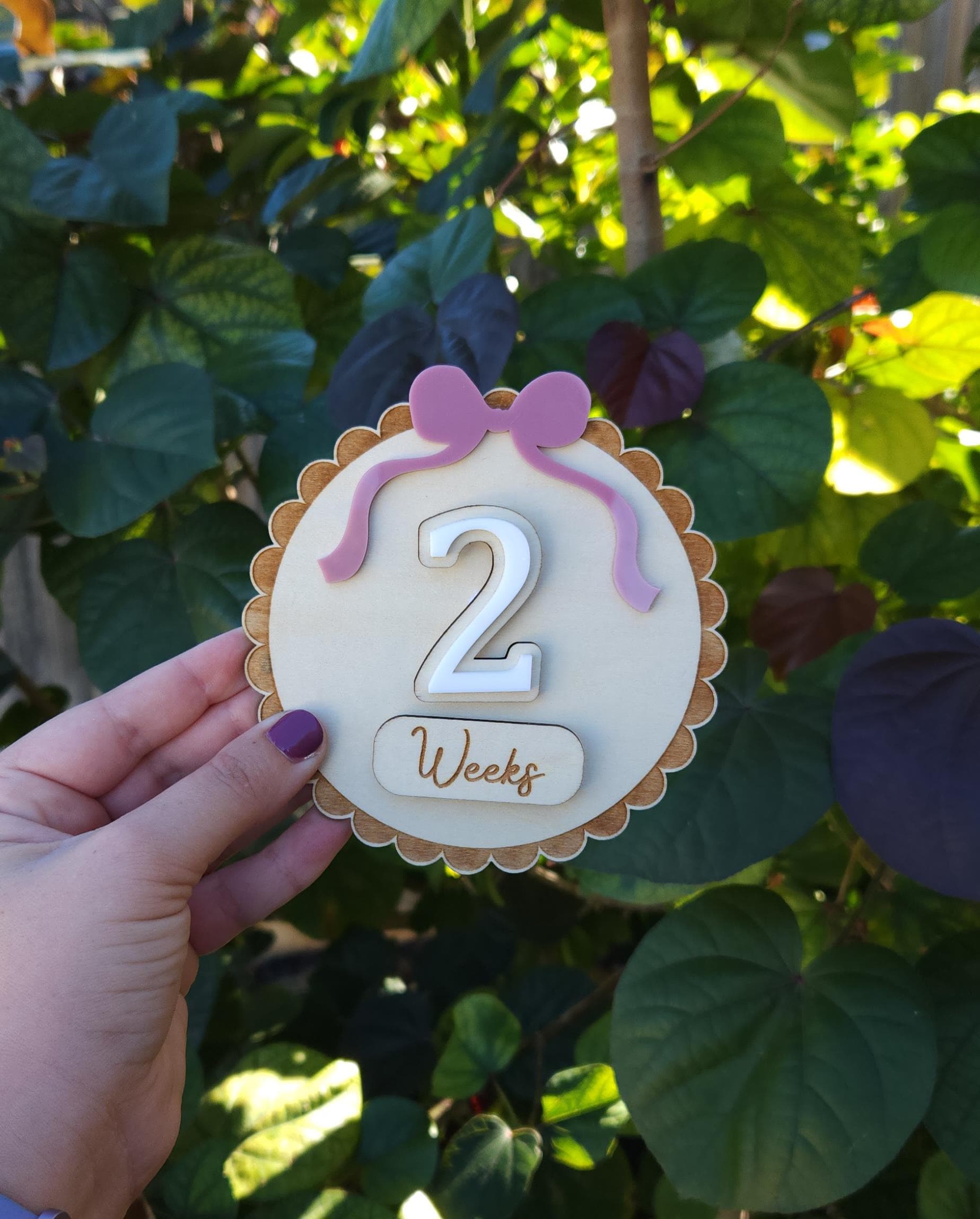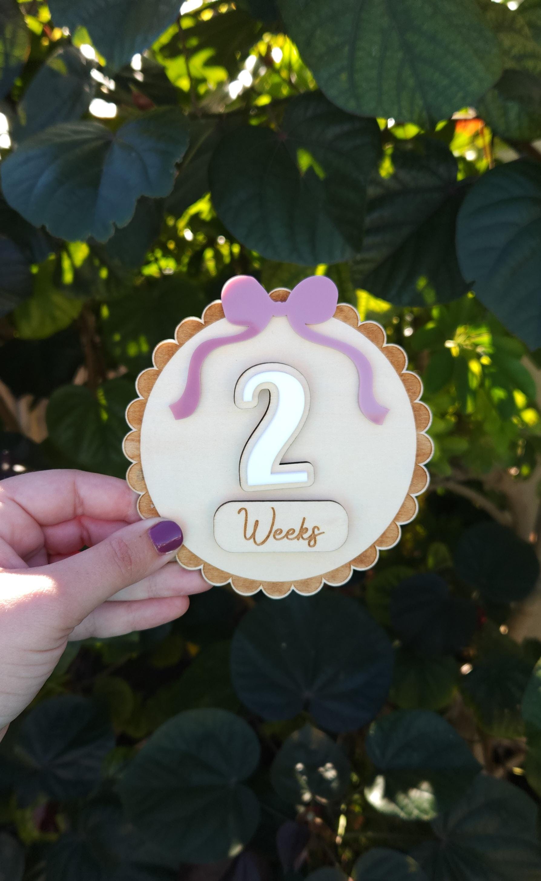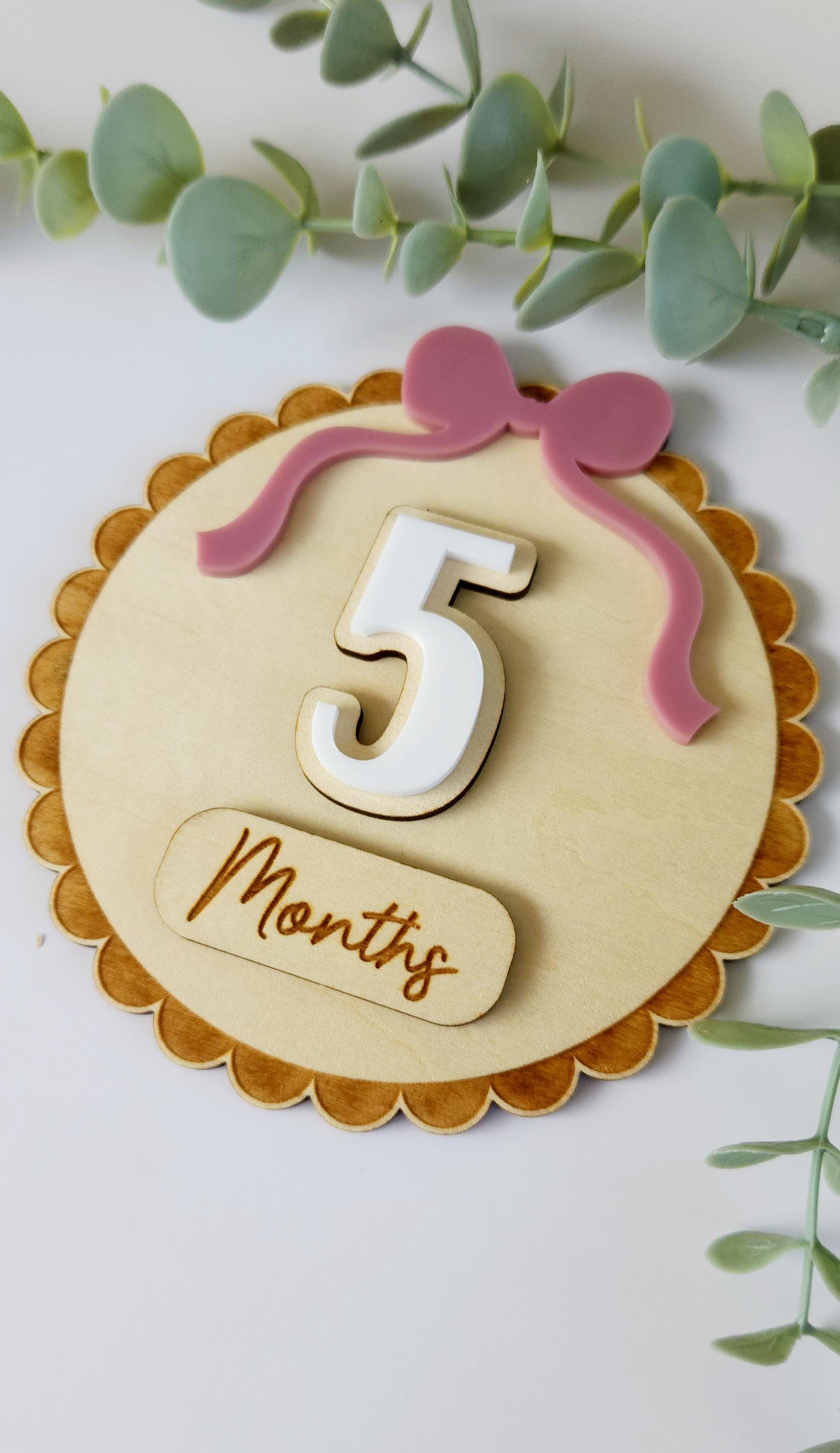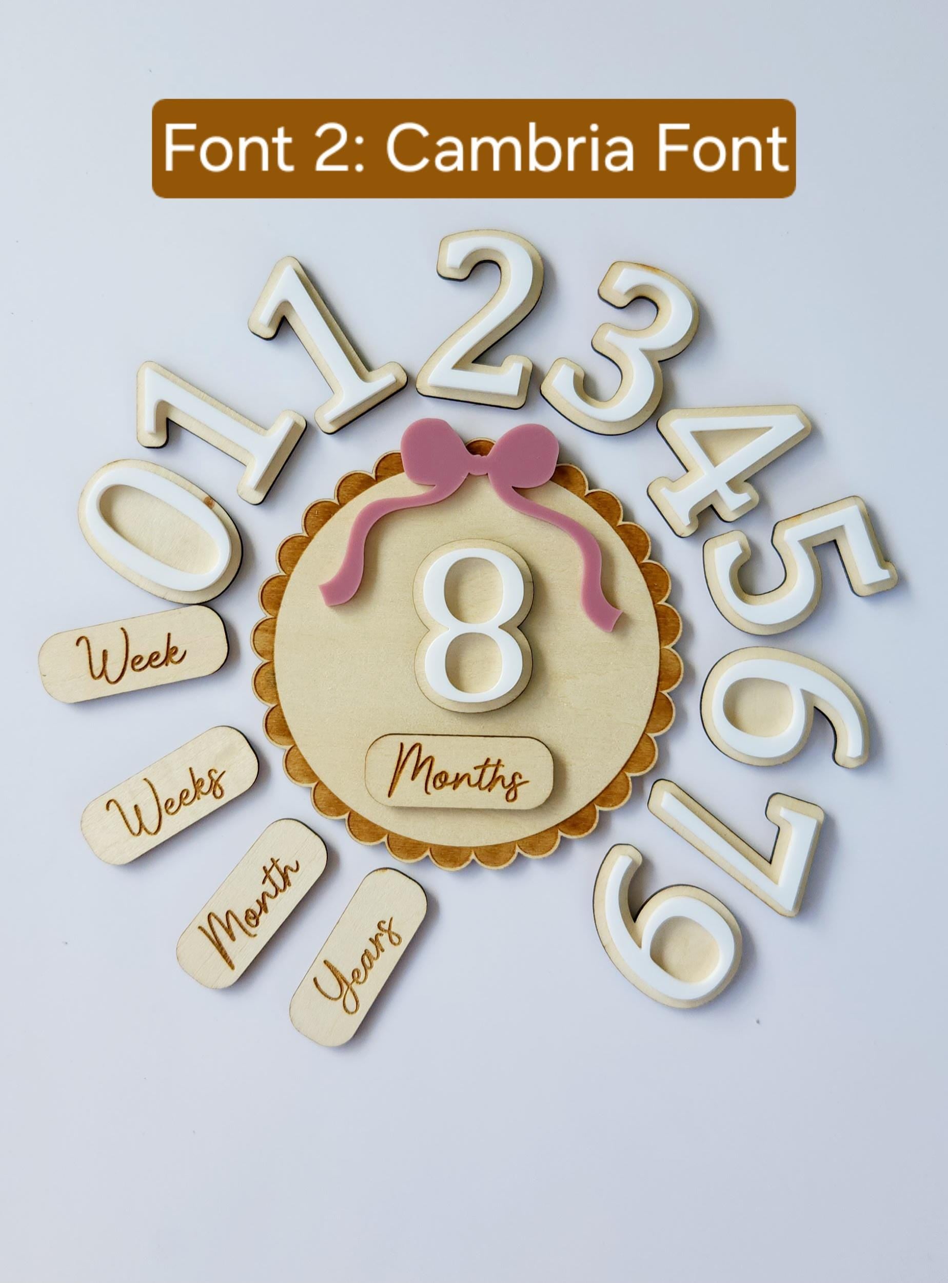 Treasure those milestones forever by using the interchangeable bow miles stone circle as a beautiful photo prop to document you little one's age and growth. It is easy and quick to change the numbers and time wording.