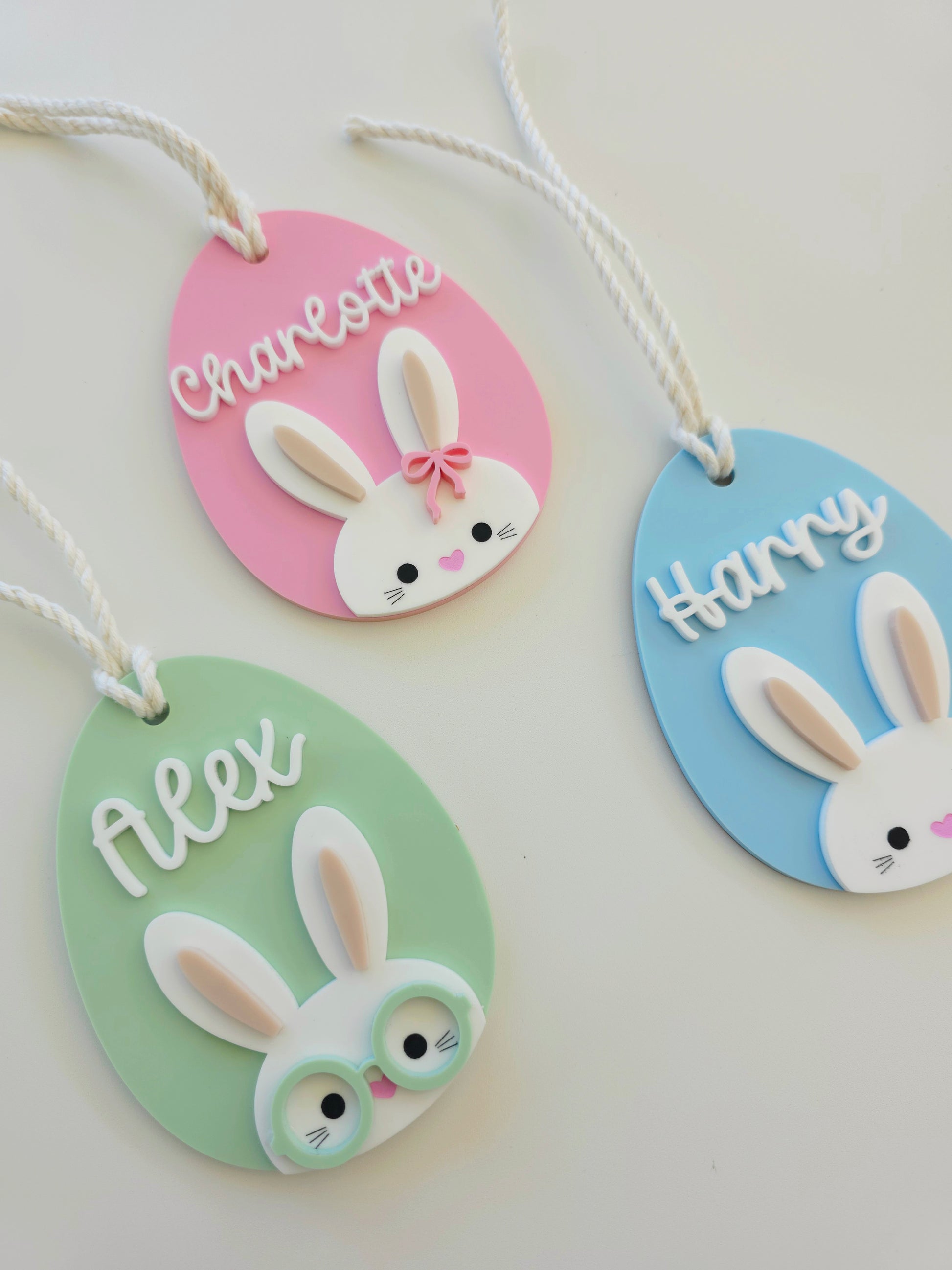 Each tag is made from layered acrylic and finished with a personalised name. With three bunny designs to choose from, these tags are fun, modern, and designed to be reused year after year.