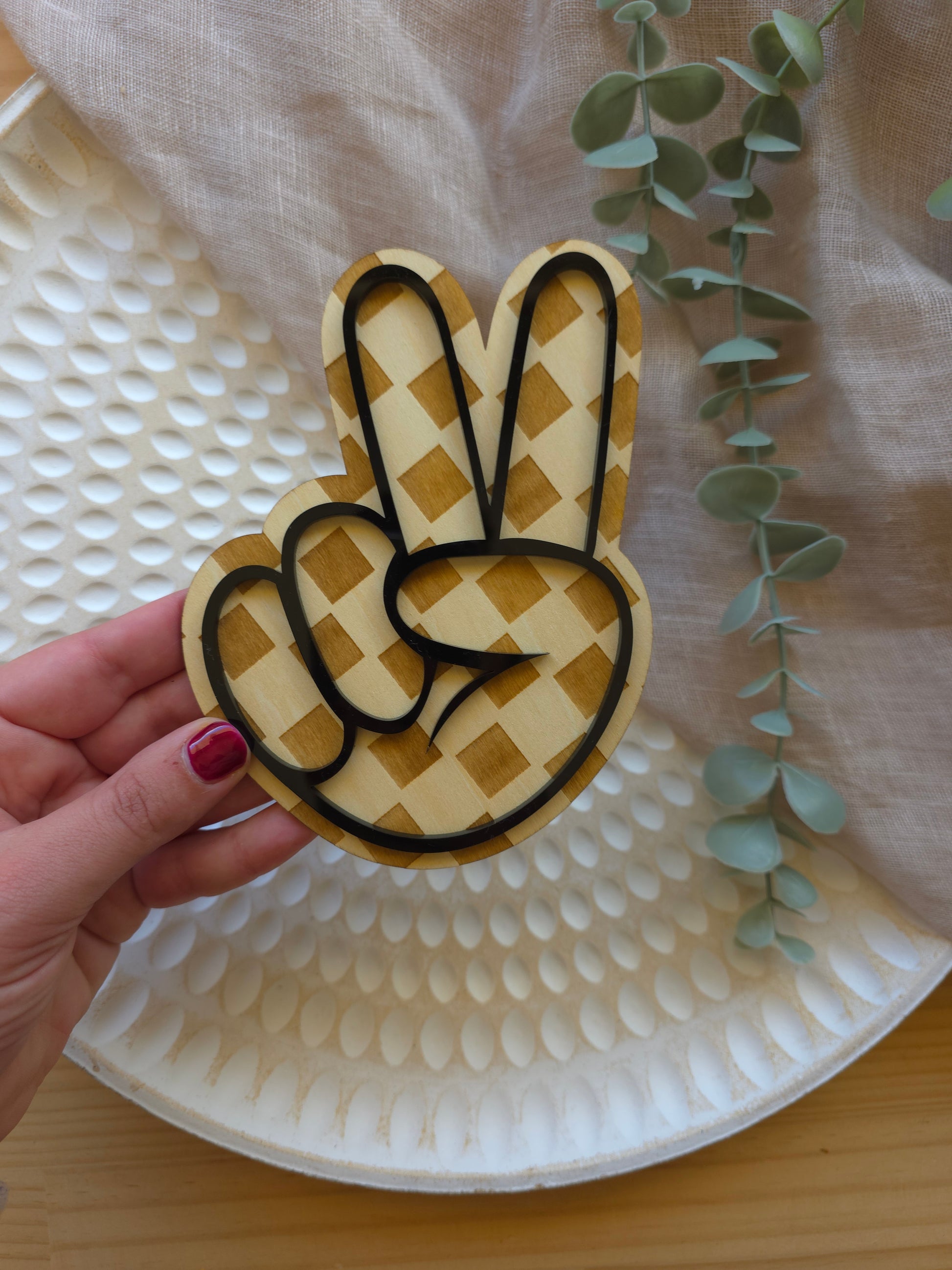 Add a cool, modern touch to your child’s bedroom or playroom with this wooden and black acrylic peace sign. Simple yet bold, this hand symbol brings a playful vibe and positive energy to any space.