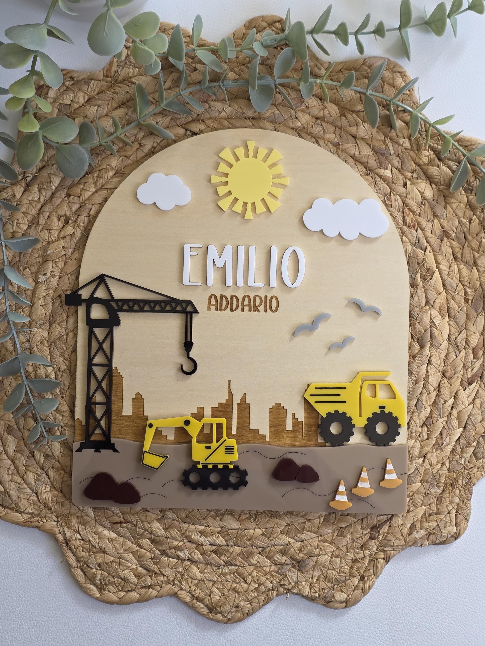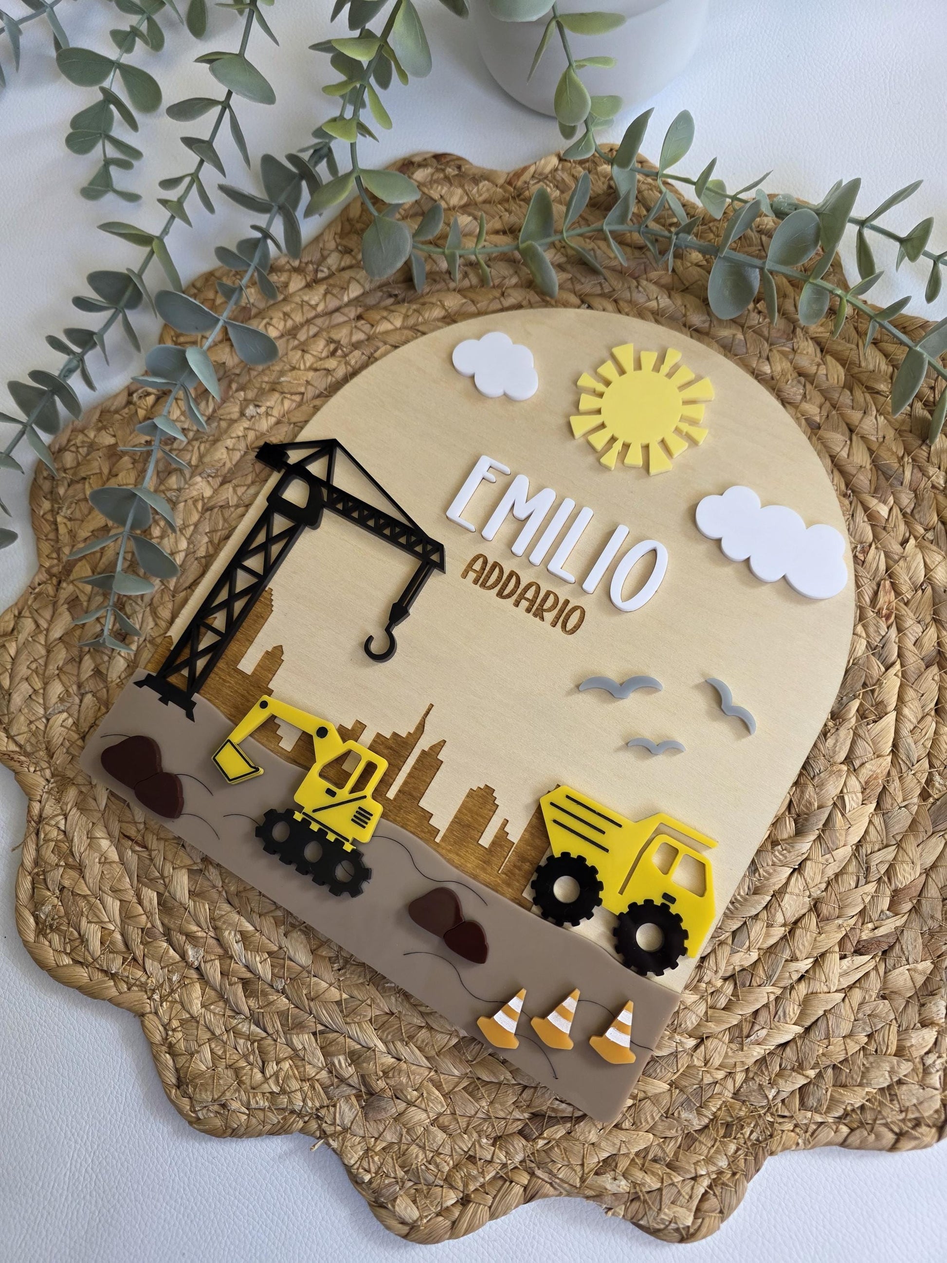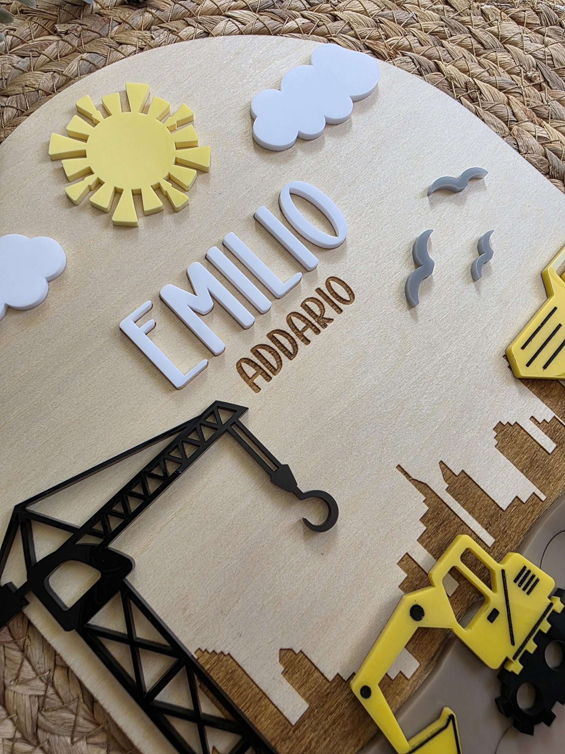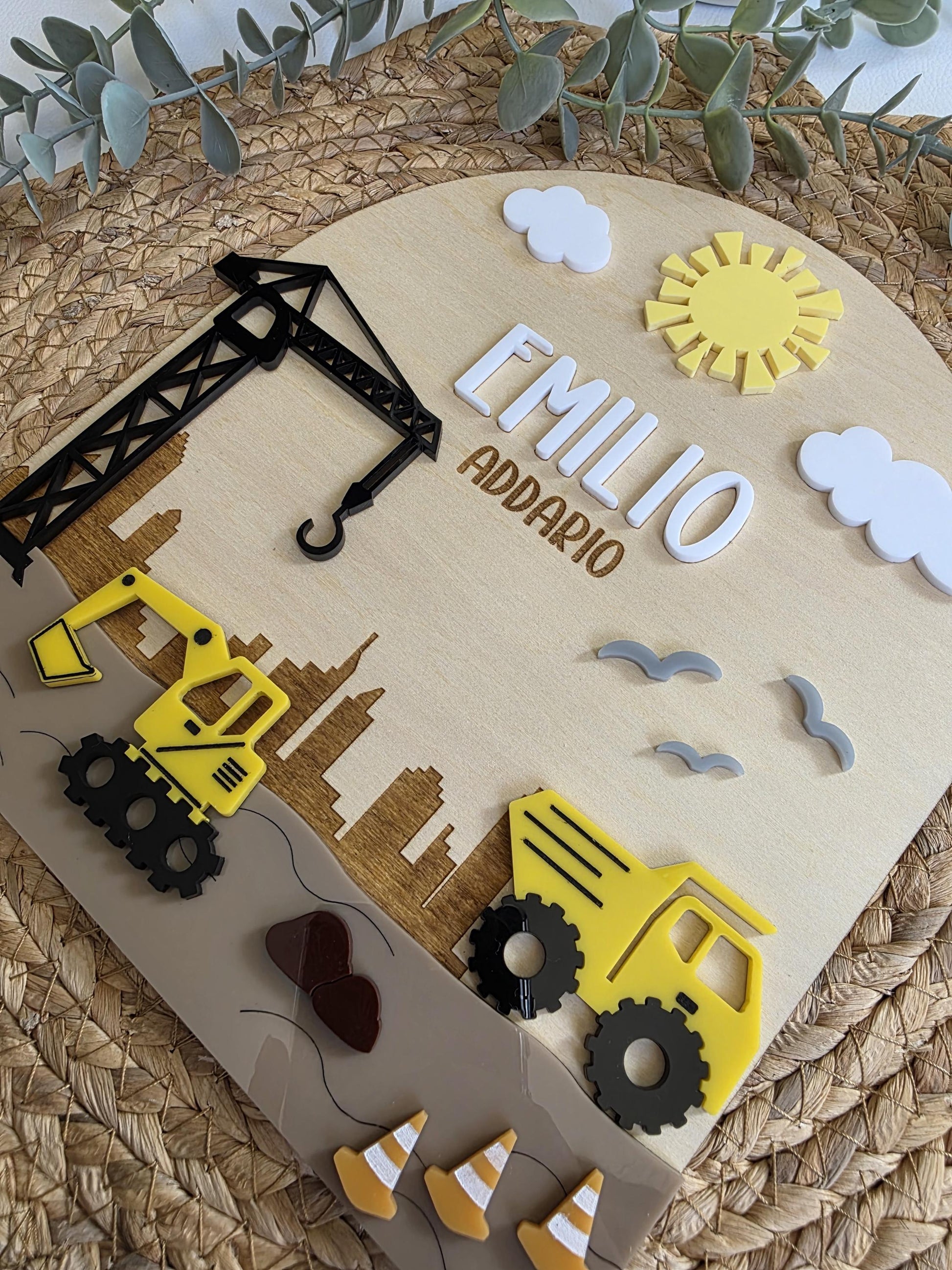This layered Construction bedroom name sign will make a beautiful addition to any construction, excavator, Dump Druck or digger crazy boy or girl's bedroom, nursery or playroom. It features a range of colours and layers to give you the 3D effect. It is personalised with up to 2 names, the first name in white acrylic and the second will be engraved into the wood.
