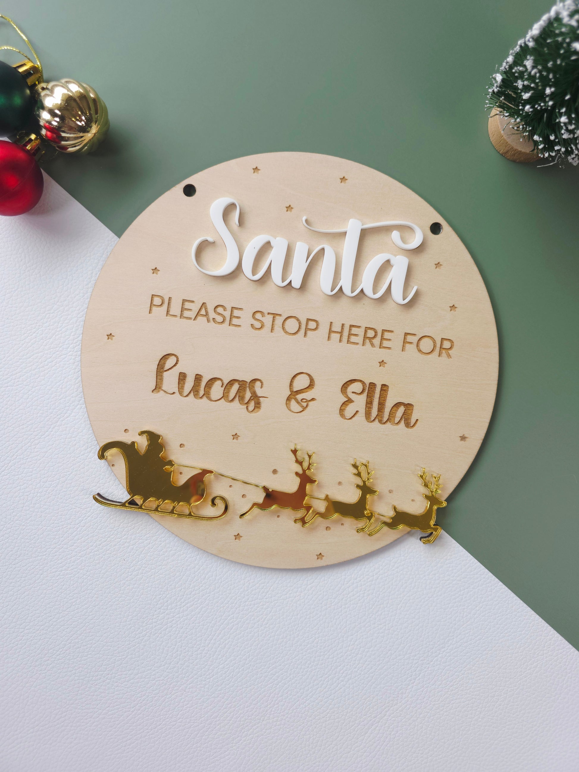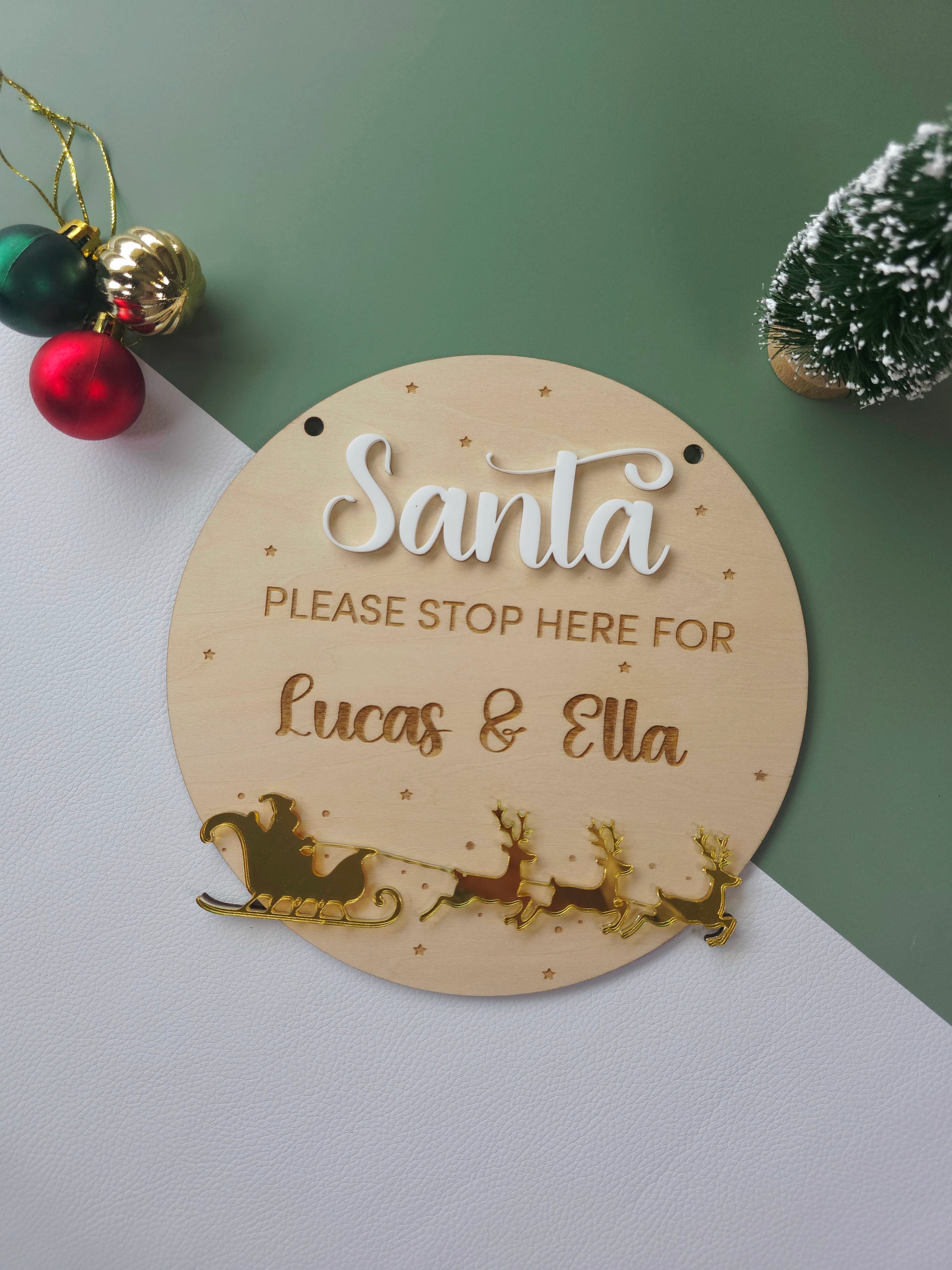 Add a touch of Christmas magic to your home with our beautifully crafted Santa Sleigh & Reindeer Sign! Made with a warm wooden background, this festive sign features Santa’s sleigh and reindeer in your choice of colour, with your family name or children’s names engraved for a truly personal keepsake.